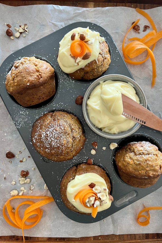 Inspired by the classic dessert, these muffins capture the essence of carrot cake with a tangy sourdough twist, topped with a luscious cream cheese frosting.
