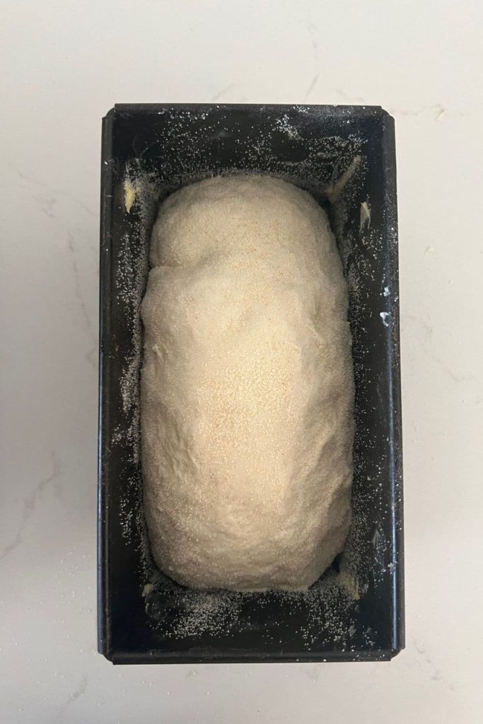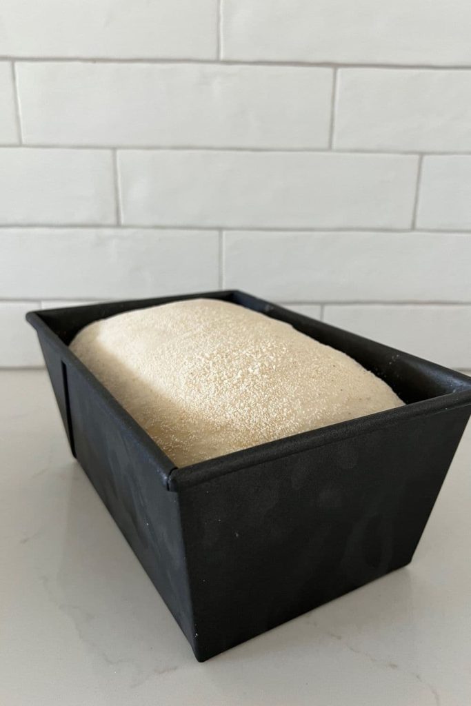 You can see in this photo that the dough isn't perfectly shaped, however it doesn't matter as the loaf pan will support the dough through proofing and baking.