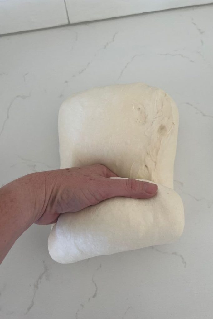 The dough can be spread into a rectangle and then gently folded before being rolled into a loaf shape.