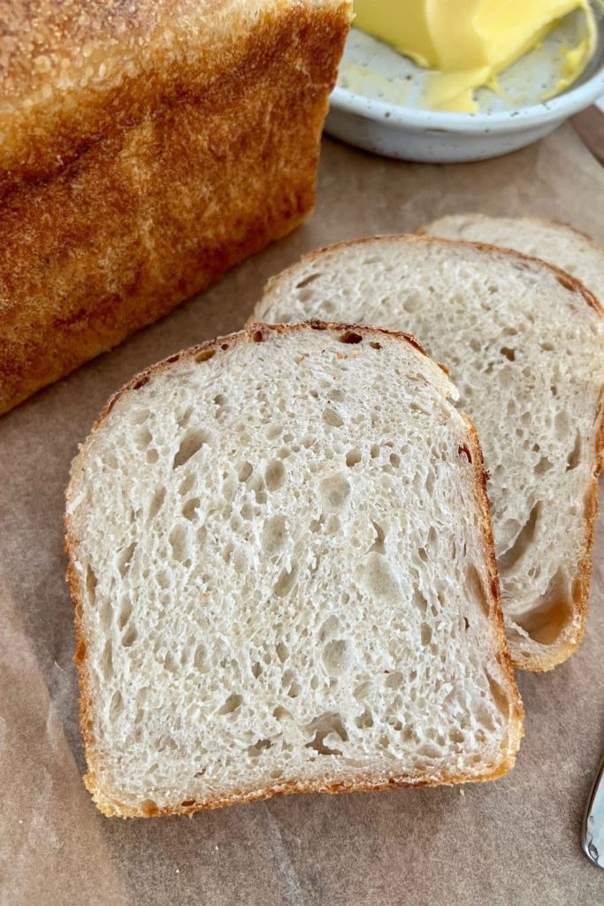 Loaf of sourdough bread baked in a loaf pan sliced and laid out in front of the rest of the loaf. There is a silver butter knife in the foreground and a butter dish in the background.
