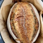 • When your sourdough is done, remove it from the oven. Let it sit for a few minutes and then carefully remove it from the tin. Place onto a wire rack to cool.
