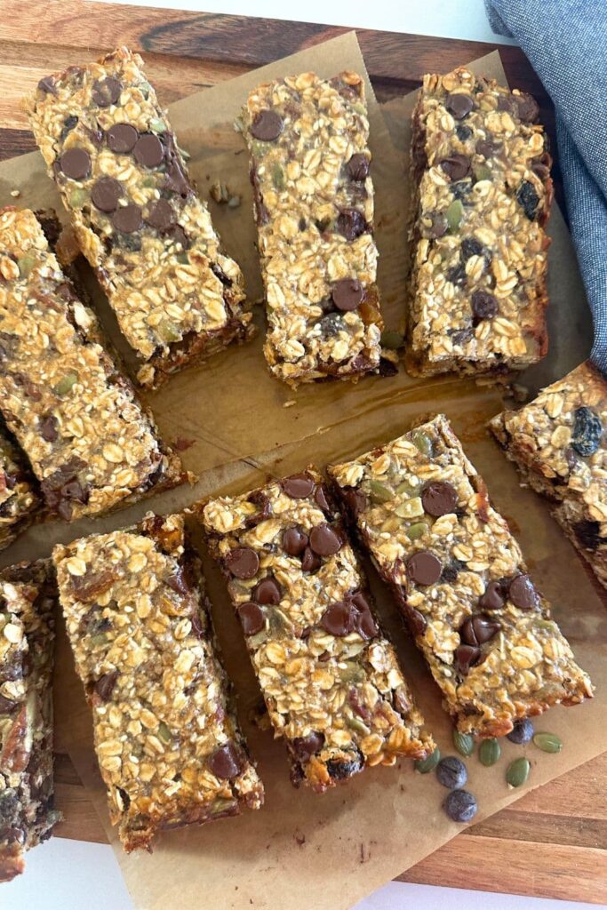 Allow the granola bars to cool in the tin before using the parchment paper to carefully lift onto a chopping board and slice into bars of your desired size.