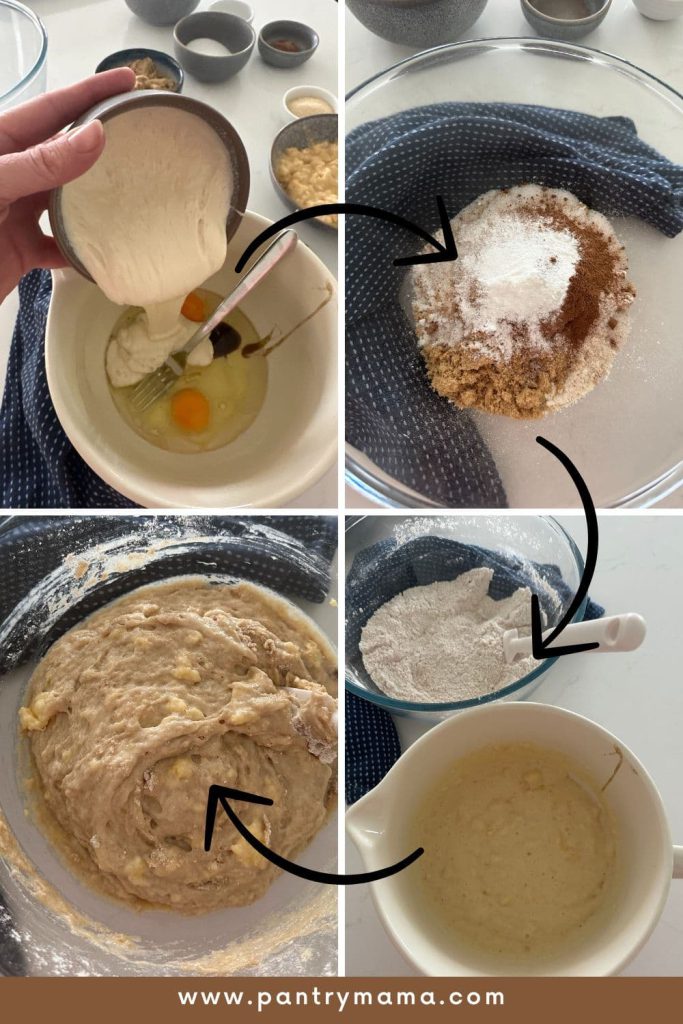 Remember that the dry ingredients need to be mixed together first, before pouring in the liquid ingredients.