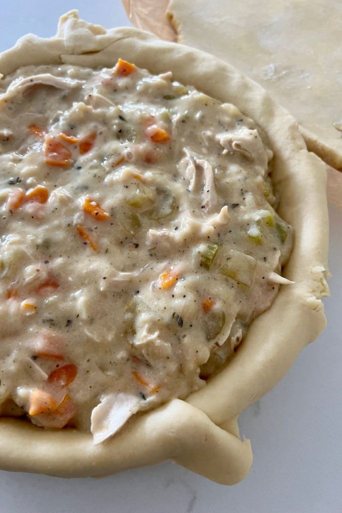 - For this recipe you'll need to prepare the sourdough pie crust in advance. When you are ready to assemble the chicken pot pie, take the sourdough pie crust out of the fridge.
