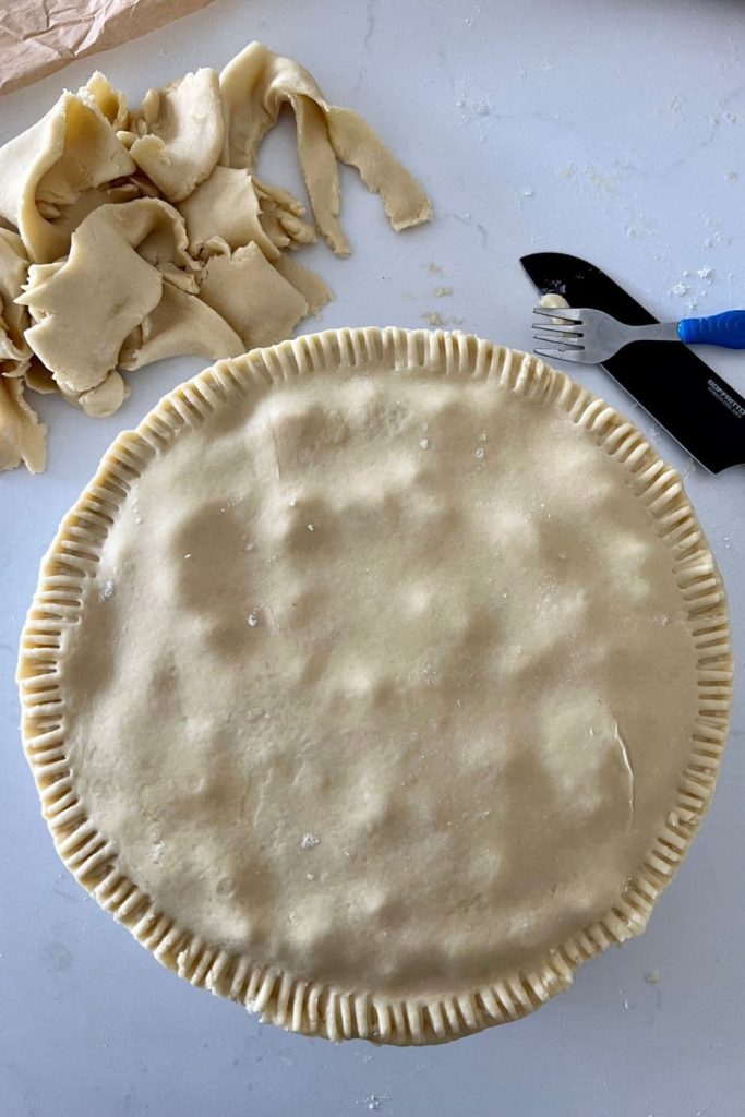 - Now roll out the second portion of pastry and place it over the top of the pie, cutting off any excess pastry.