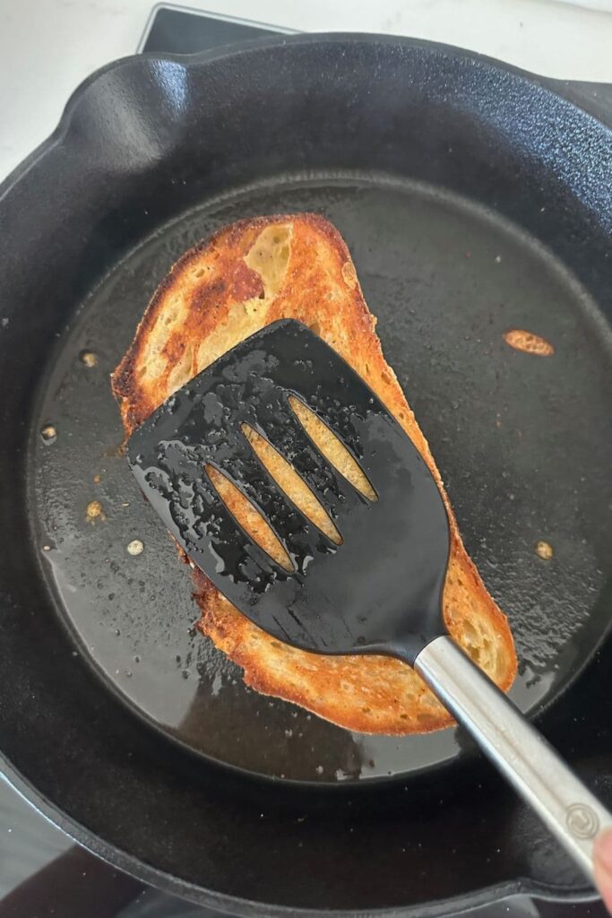 - Lightly squish the sandwich down with a spatula to ensure the outside of the sourdough bread gets really brown and crispy.
