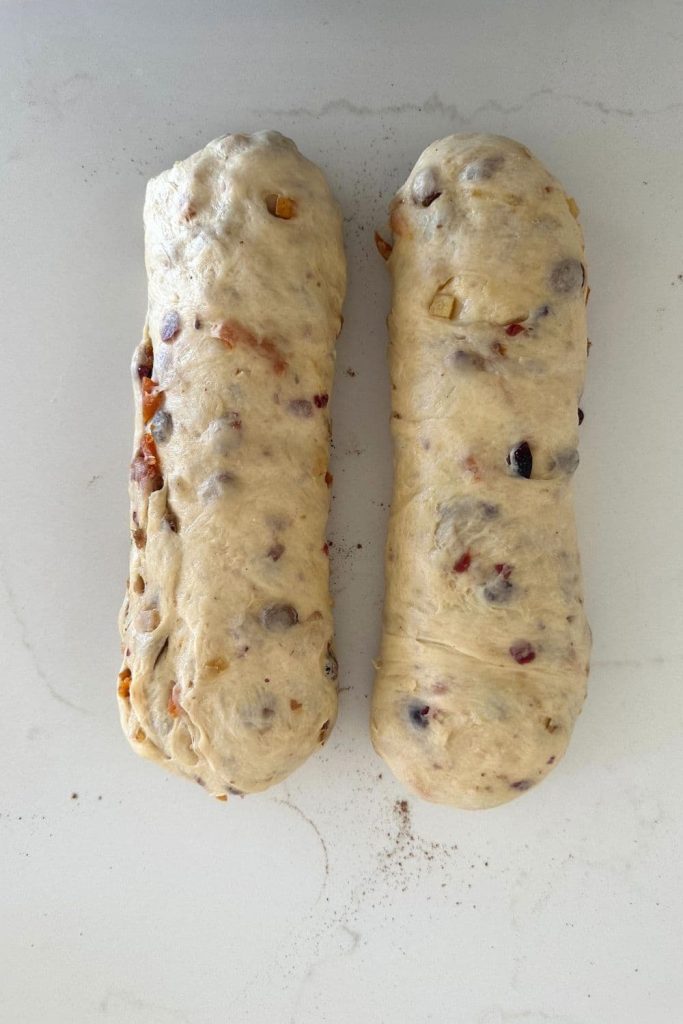 - Transfer each stollen to a baking tray lined with baking paper and cover with a damp kitchen towel. Allow the stollen to proof at room temperature until the dough has risen around 50% again.