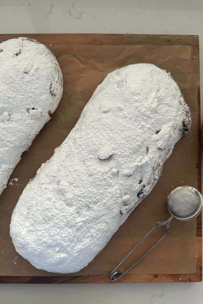 It's known for it's snow white powdered sugar coating which actually protects the Christmas sourdough stollen and makes it last a long time, even outside of the fridge. This sourdough version features the iconic tang of sourdough starter and lengthy fermentation.