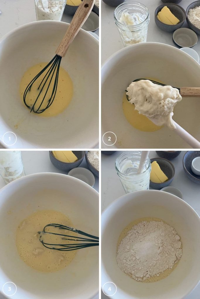 - Add the sugar, buttermilk, milk and egg to a large mixing bowl and whisk well to combine and dissolve the sugar.