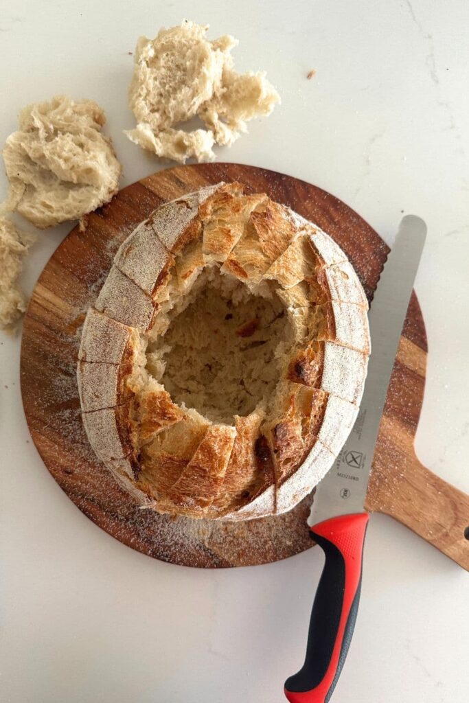 Once you have a hole big enough, use your knife to cut the outside of the bread into pieces, without actually cutting the bottom of the bread. This will make the bread easy to tear off and dip into the melted butter.
