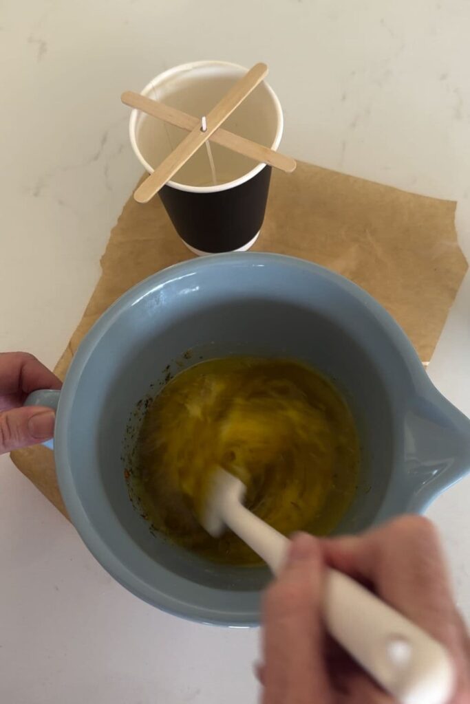 - Carefully pour the melted butter into the paper cup, ensuring you don't disturb the wick.