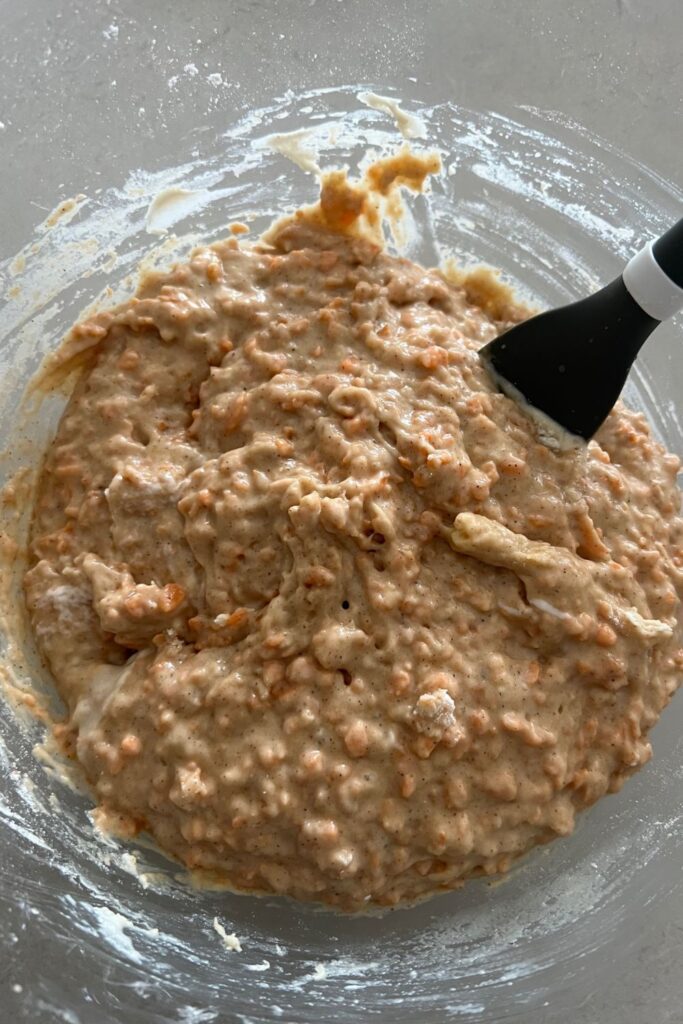 - In a separate bowl mix together shredded carrot, all purpose flour, salt, baking powder, baking soda, spices and brown sugar.
