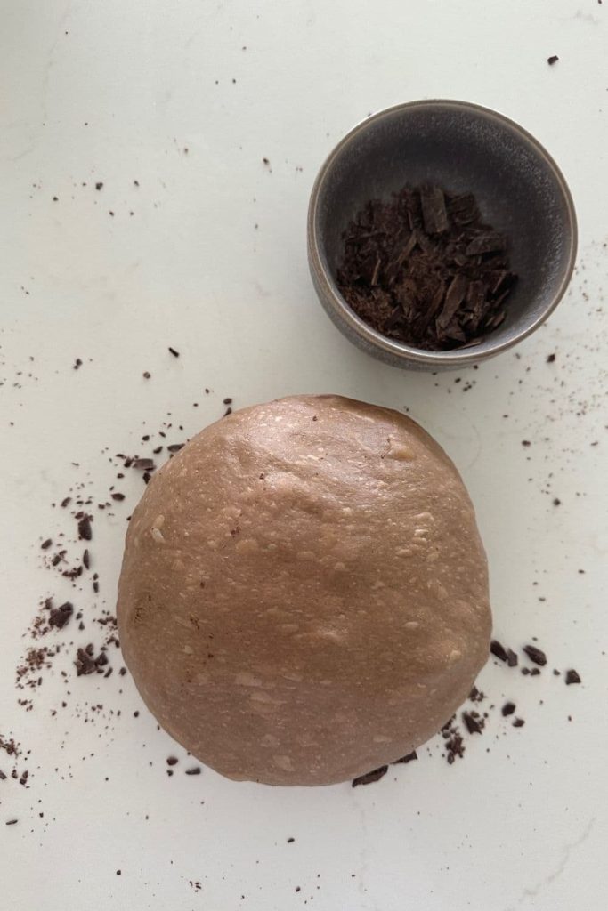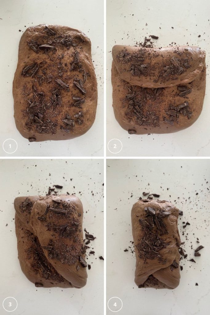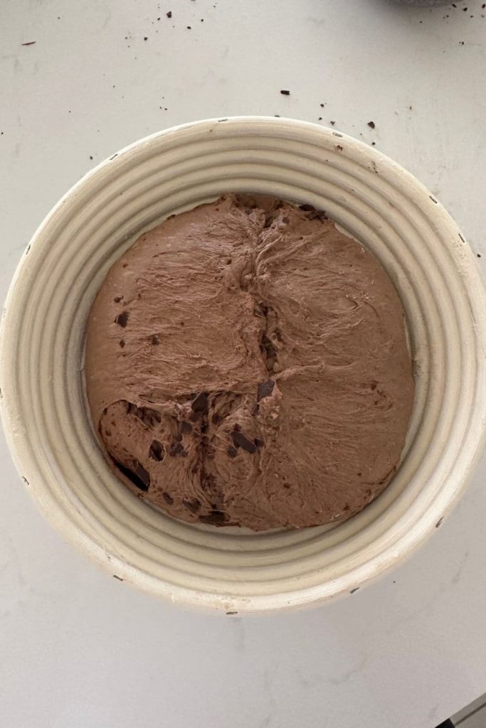 - Shaping The DoughOnce your dough has finished its first ferment, it's time to shape it and add the chopped chocolate. Before you start, grab the banneton you're going to be using and sprinkle some rice flour or semolina on the bottom of the banneton. Right, let's shape that dough.Use a dough scraper to gently ease the dough out of the bowl (your hands work just fine if you don't have one). You want it to land upside down on your counter so that the smooth top of the dough is on the countertop and the sticky underside is facing up. This will make it easier to shape.Before you shape the dough, pull it out into a rough rectangle. Sprinkle some of chopped chocolate over the dough. As you shape it into a batard or boule, keep sprinkling the chocolate on every fold (you can see photos of me doing this above). You can also see a video of me shaping a batard here.When you have finished shaping, the chocolate should be neatly tucked inside the dough.