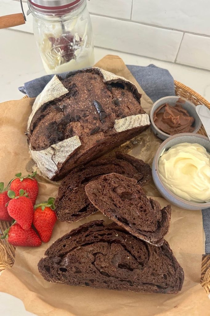 - Toast slices of chocolate sourdough bread and serve with a selection of toppings like nutella, caramel sauce, whipped cream and strawberry jam (you can see this in the photos of this post).