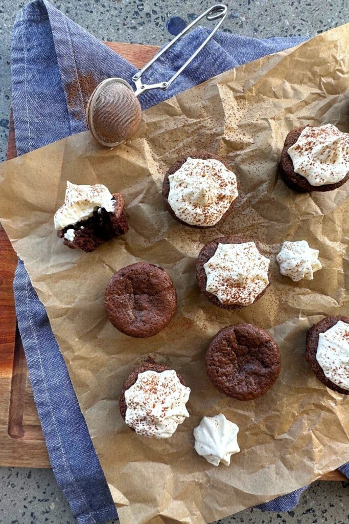 You can store these sourdough chocolate brownie bites in the fridge in an airtight container for up to 1 week. I actually prefer the texture served straight out of the fridge. This is a great option if you are going to pipe the cream on too (you'll need to look at the expiration date of your cream to judge how long you can store the bites in the fridge for).