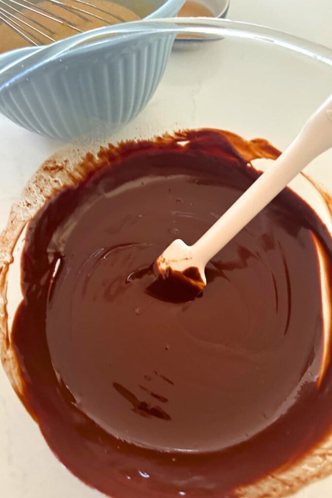 - In a large mixing bowl melt 350g of the chocolate chips together with the butter (put the other 100g of chocolate chips aside for later). I do this in the microwave - I place both ingredients in a glass bowl and do 30 second bursts until they are melted. Stir together until smooth and glossy and then set aside.