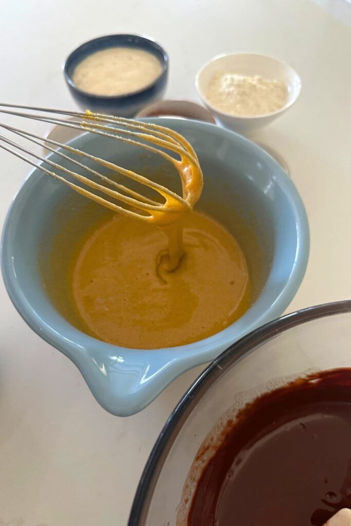 Now, add the eggs and egg yolk, vanilla extract and brown and white sugars to a batter jug and whisk together until they are smooth and glossy (like runny caramel). Set this aside.