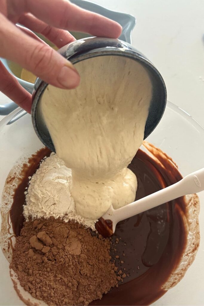 - Now, grab the bowl of melted chocolate and butter. On top of this add the cocoa, flour, sourdough starter, baking soda, salt and egg and sugar mixture, as well as the extra 100g of semi-sweet chocolate chips that you reserved.