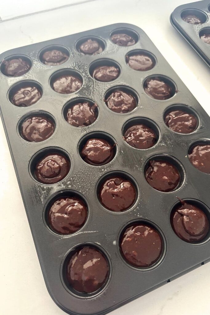- Divide the mixture evenly into the 2 x 24 mini muffin pans. I find it easiest (and fairly mess free) to use a disposable piping bag, but a cookie scoop or spoon works too. Fill them around half to ¾ full.