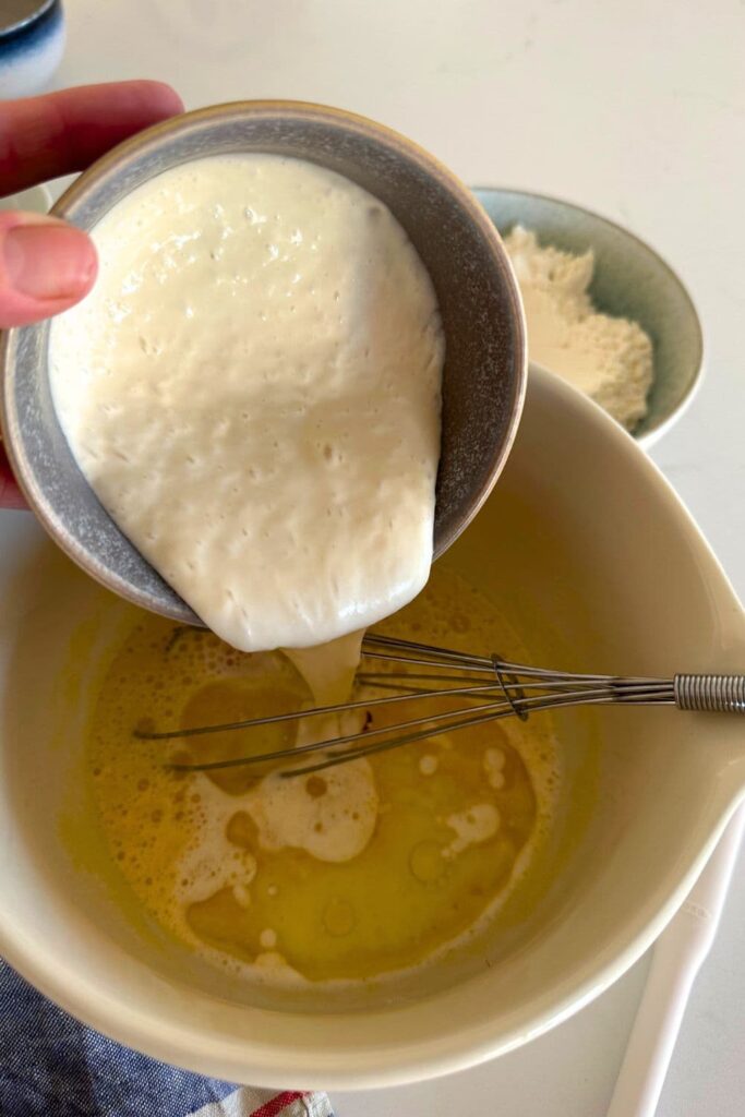 - Now add the vegetable oil, milk and sourdough starter and mix until light and foamy.
