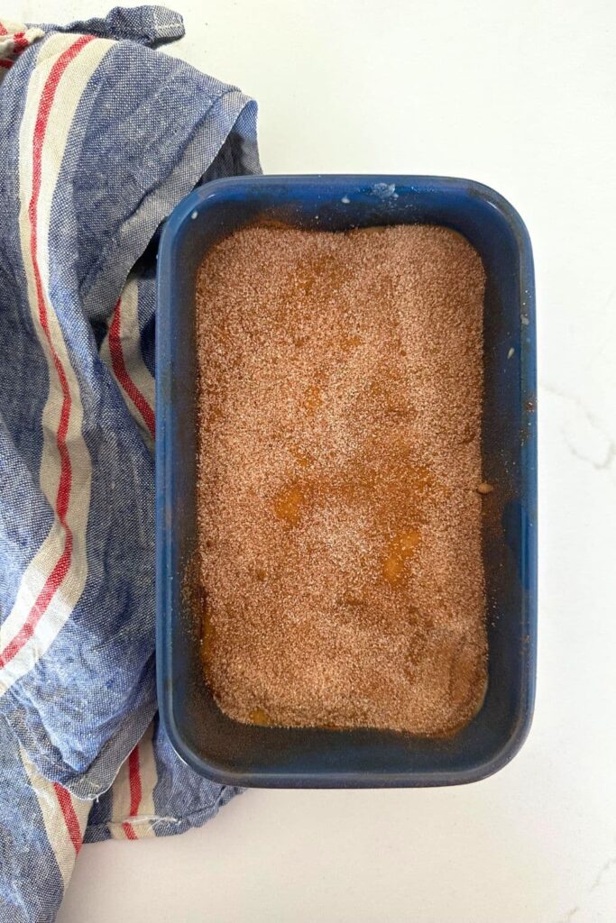 Cover the cinnamon sugar mixture with the remainder of the batter and then sprinkle the remainder of the cinnamon sugar mixture on top of that.