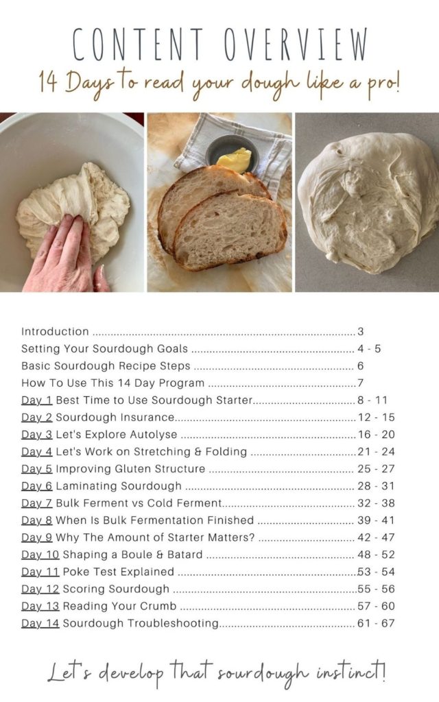 You'll find 14 days of information and activities to help you understand the sourdough process at a deeper level. You will see why your dough is behaving the way it does and what is giving you the results you're getting.
