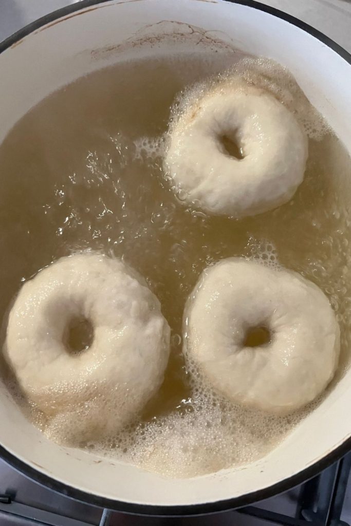 The boiling of the bagels sets the crust and gives them their signature chewiness. The longer you boil them, the chewier the crust will be.