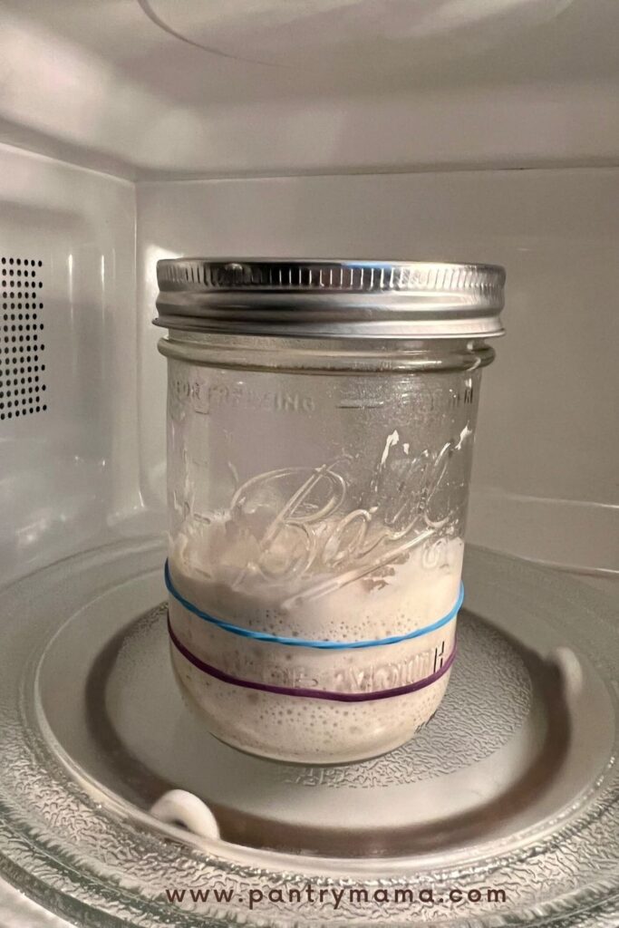 - Mix the sourdough starter into the jar of flour and water and allow it to ferment for 12 hours.