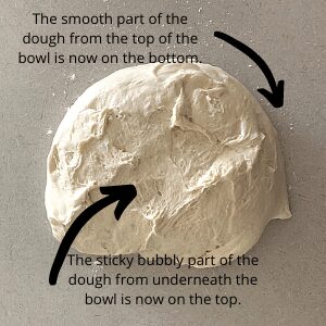 When you tip the dough out on the counter to shape, you need to make sure you tip it out upside down, as demonstrated in this photo.
