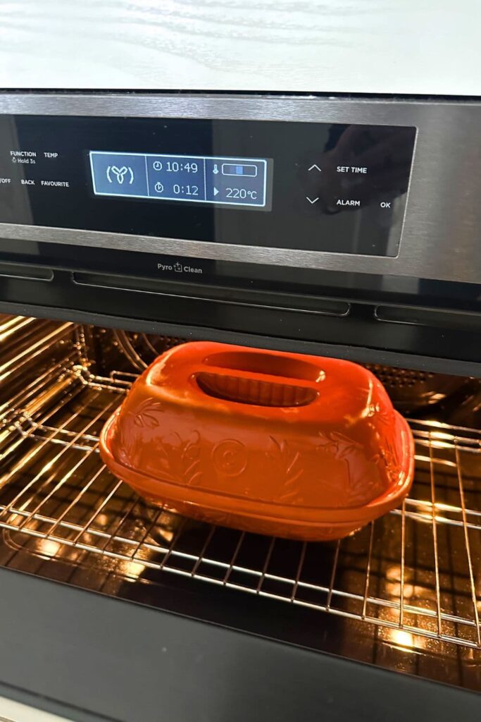 Once you're ready to bake, dry off the excess water with a towel and place into your oven. Turn the oven on (no more than 220C (428F) and allow the pot to preheat inside the oven.