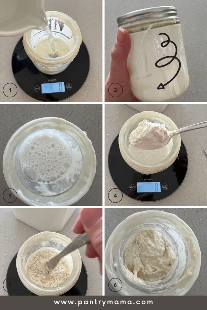 - If feeding into a clean jar, always add water first, then sourdough starter then flour. This will enable you to mix it together more easily and you won't have such a mess (you'll find more cleaner sourdough baking tips here).
