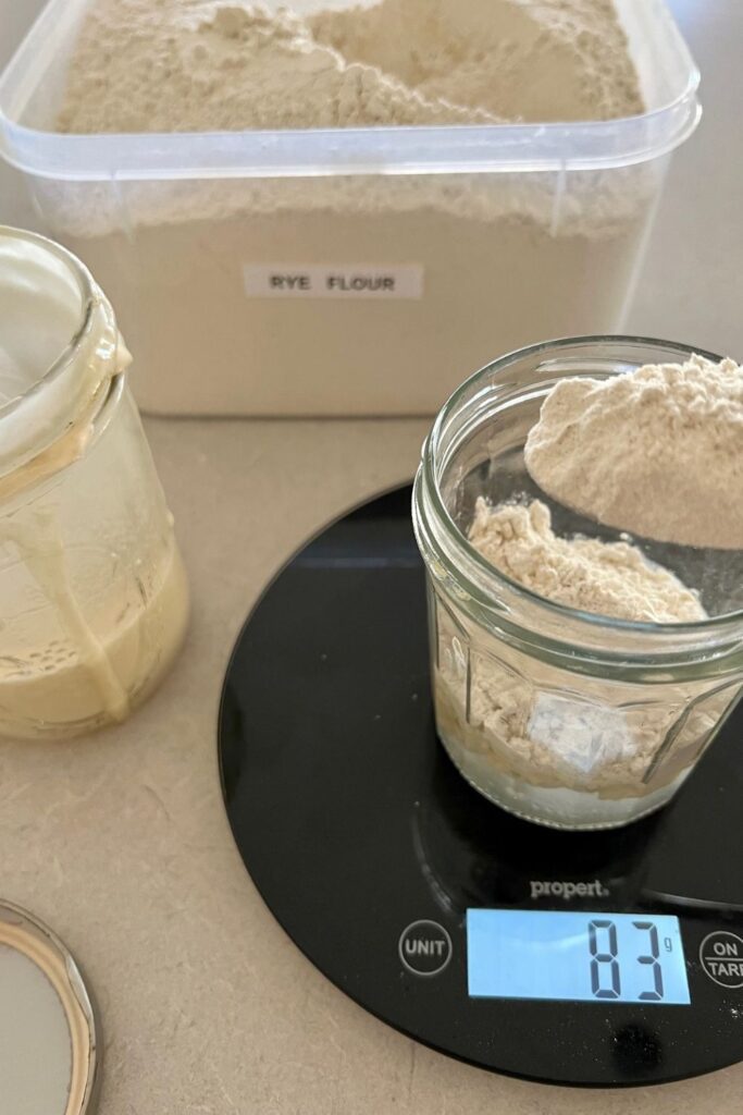 - Weigh out 25g of sourdough starter using a digital scale. Discard the rest of the starter (this can be used for discard recipes so long as your starter is at least 7 days old).