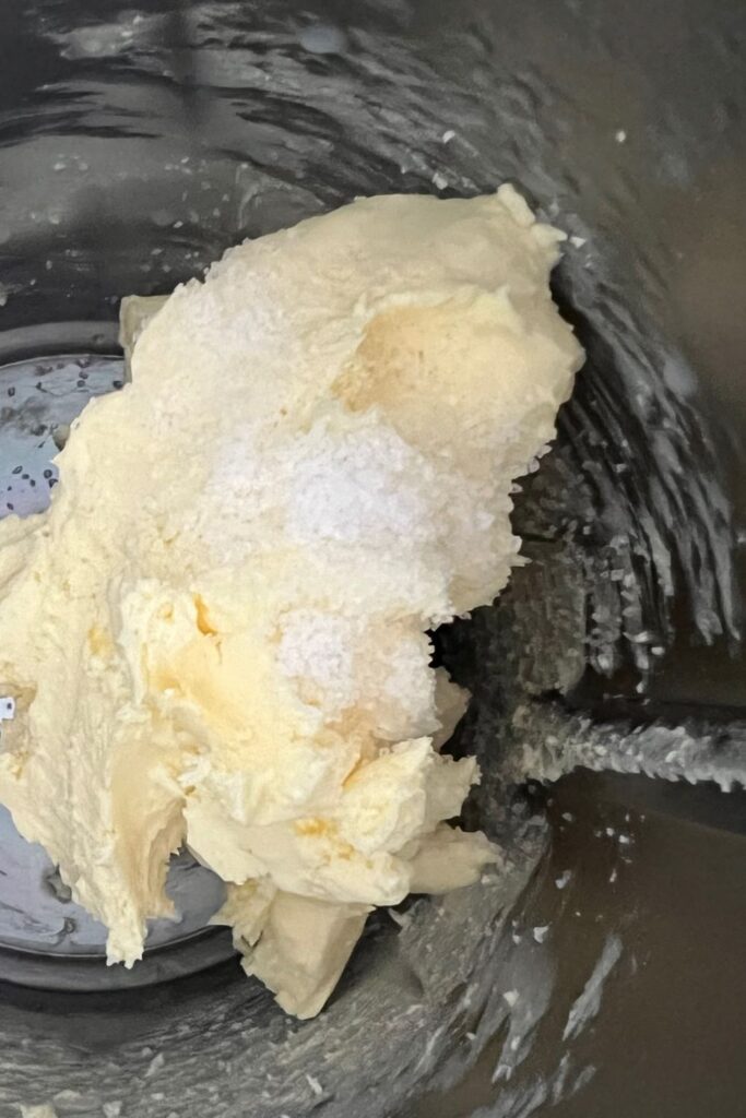 - Add the butter back to the stand mixer bowl and pour over one litre of icy cold water. Turn the stand mixer on and gradually increase from lowest speed to highest speed for around 30 seconds to one minute. Once the butter has collected in the wire whisk, turn the mixer off.