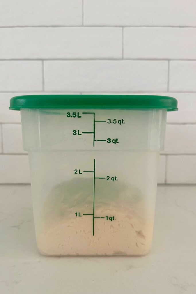 When you're doing your initial mix and into your bulk ferment, you don't want to place your dough into a huge bowl. Why? Because you only want the dough to double, nothing more. Even just under double if you don't want to risk over fermentation.