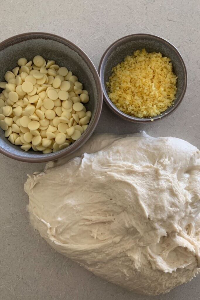 - Develop gluten through stretches and folds and add the lemon zest and white chocolate.