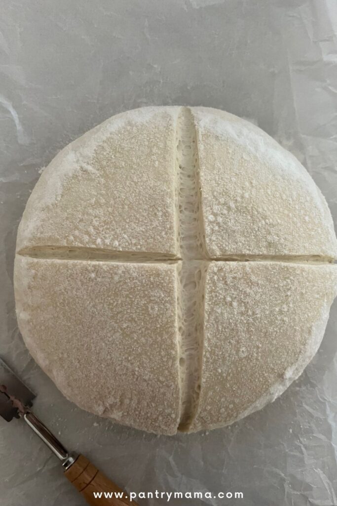 Gently score your bread with a lame, clean razor blade or knife. At minimum a large cross is sufficient, but you can get as artistic as you like. You can find my full guide on how to score sourdough bread here.