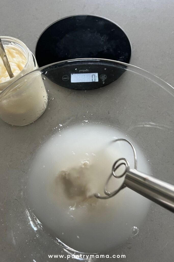 Weigh out your sourdough starter and water into a large ceramic or glass bowl.