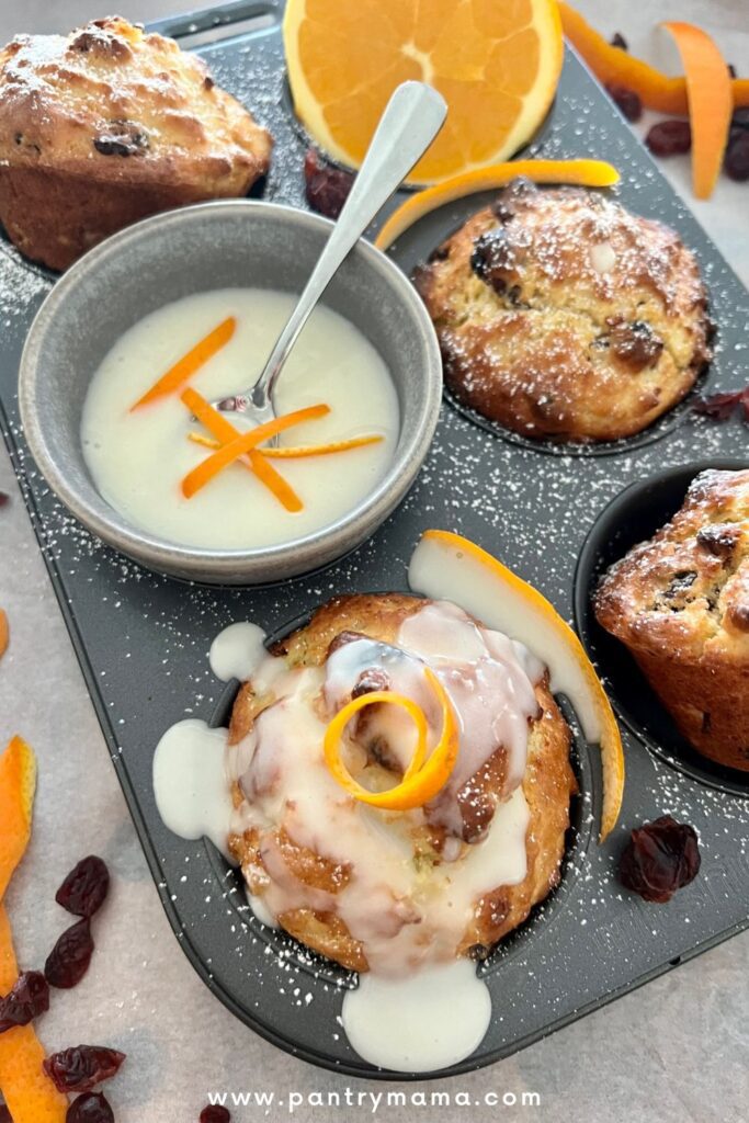 - Top with a simple glaze (you can make a simple orange glaze by combining powdered sugar and freshly squeezed orange juice until it forms a thickened consistency).
