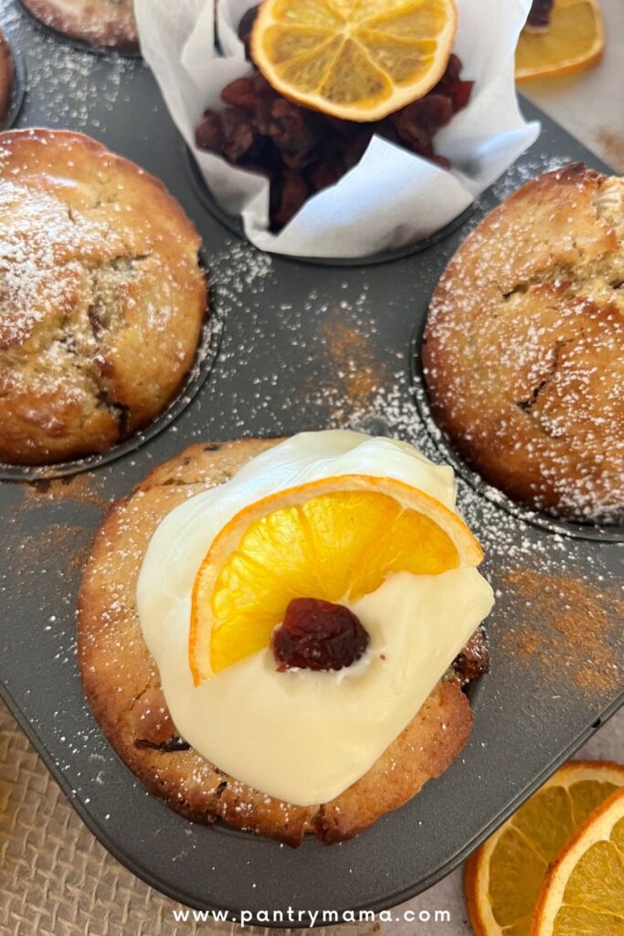 These muffins are perfect just as they are - or with a little dusting of powdered sugar, but I also love to serve them with a simple glaze or even frosting for something more decadent! And I love to add a dehydrated orange slice for some extra pizzaz too!