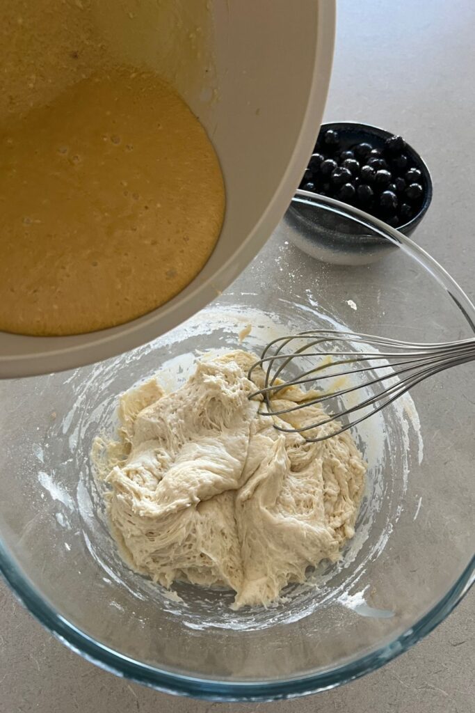 - Now pour this batter into the fermented milk and flour. Use a whisk or metal spoon to combine the two batters. It can seem like they won't combine, but keep going, they will! The batter will be quite stretchy and feel different to a normal muffin batter.