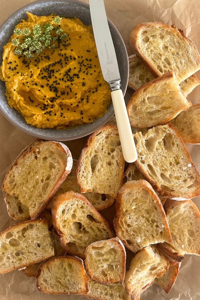 This dip is so versatile! You can basically use it in the same way you would use regular hummus. I love serving it with sourdough French bread, baguettes or sourdough crostini. These vegan sourdough crackers and sourdough pita chips work really well too!