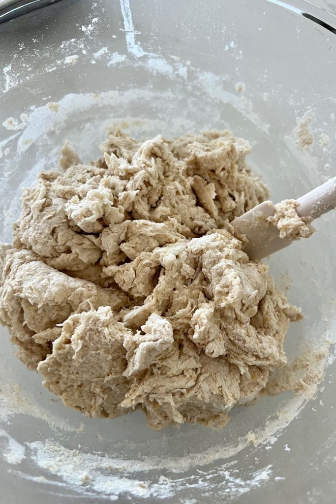Use a silicone dough scraper to gently ease the dough out of the bowl. You want it to land upside down on your counter so that the smooth top of the dough is on the countertop and the sticky underside is facing up. This will make it easier to shape. This isn't a sticky dough though so it should be failry easy to work with.