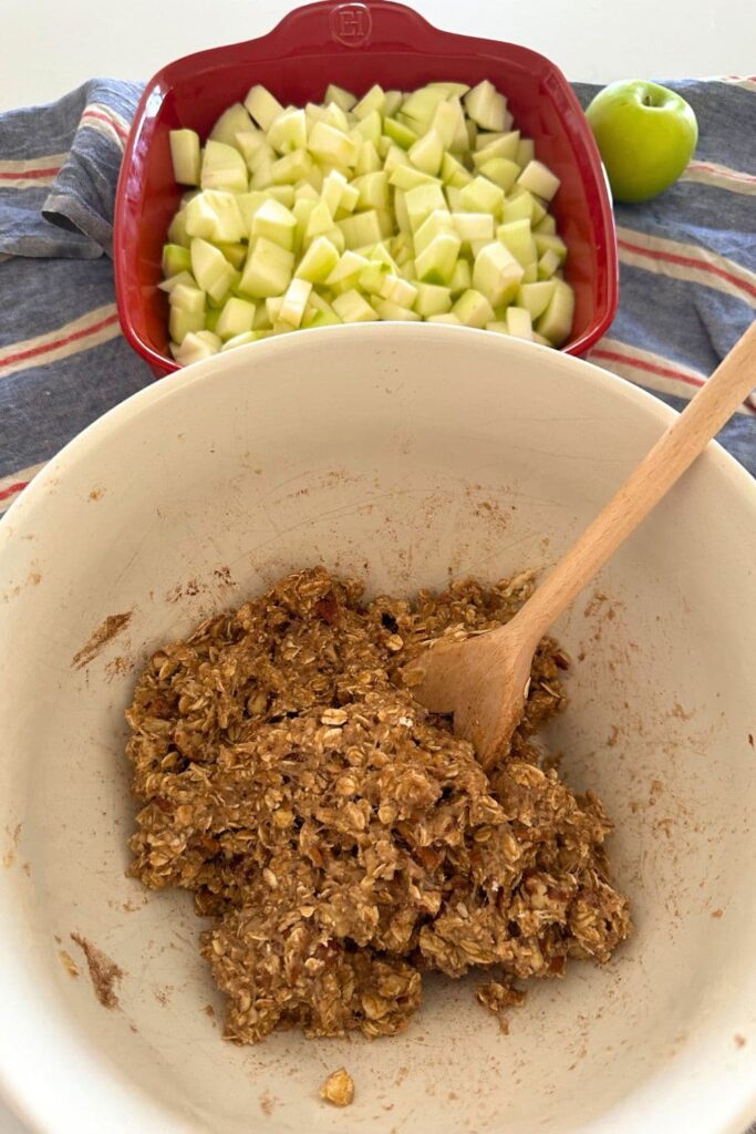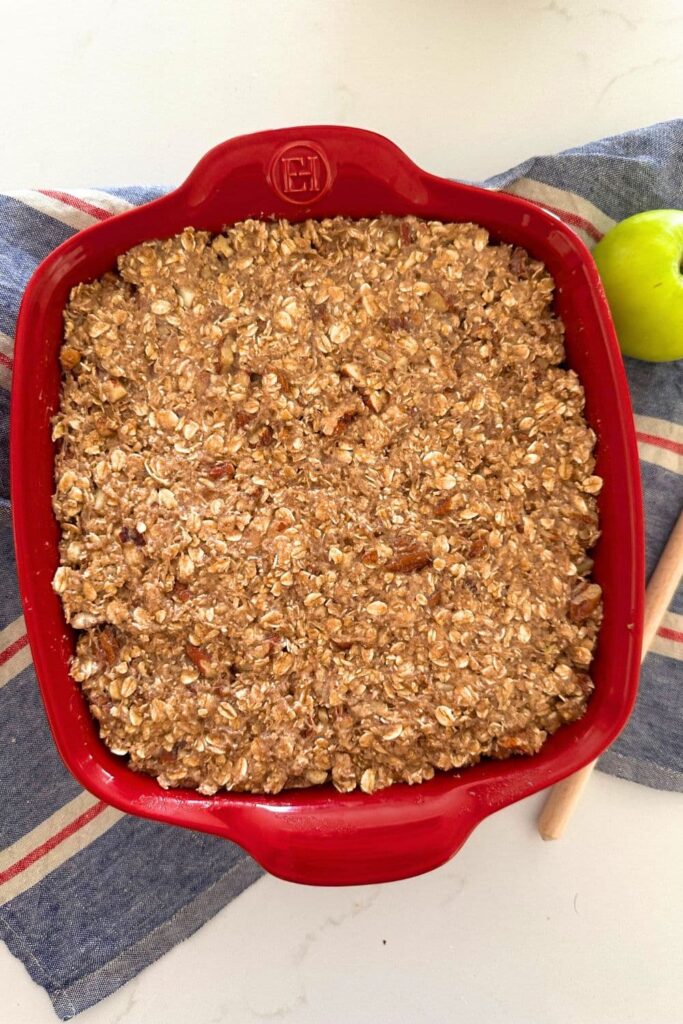 - Take your sourdough apple crisp topping and place it on top of the apples. Use your fingers to press the mixture all over the apples, essentially sealing them into the bottom of the dish.