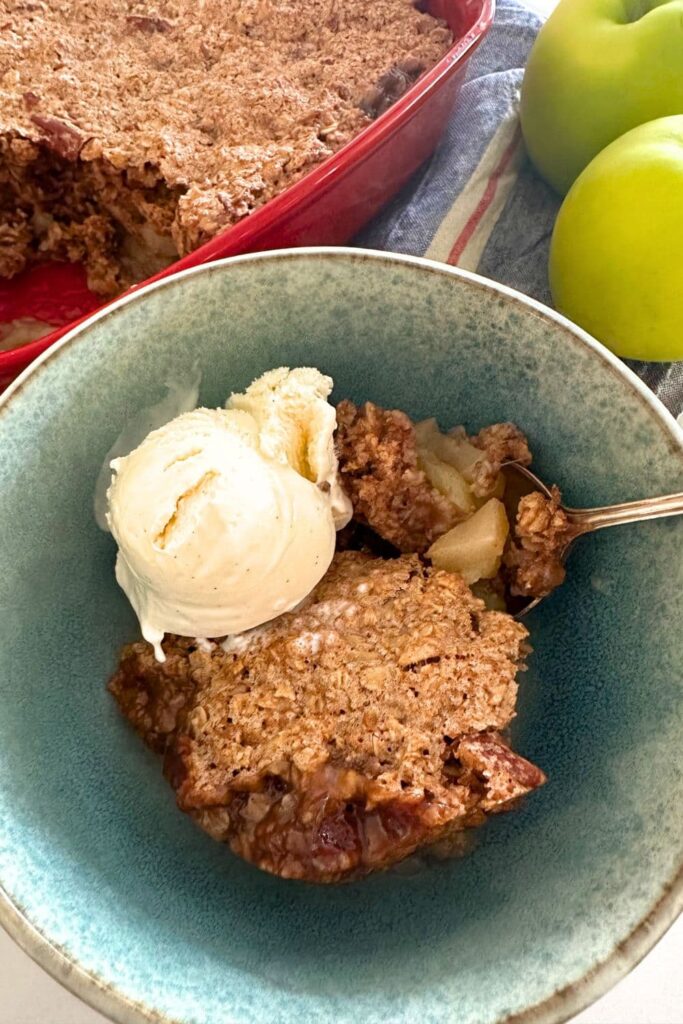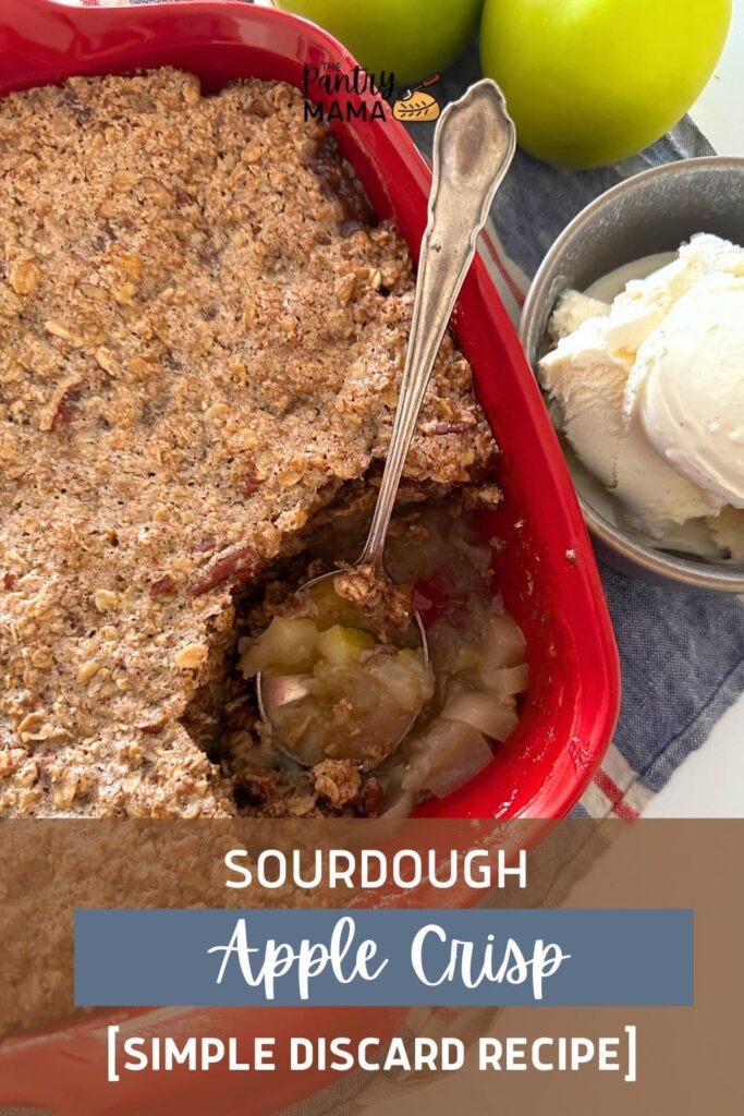 This sourdough apple crisp will be a family favorite apple dessert in no time! Delicious granny smith apples smothered in a crispy sourdough topping and served with vanilla ice cream, you are going to love this sourdough apple crisp!