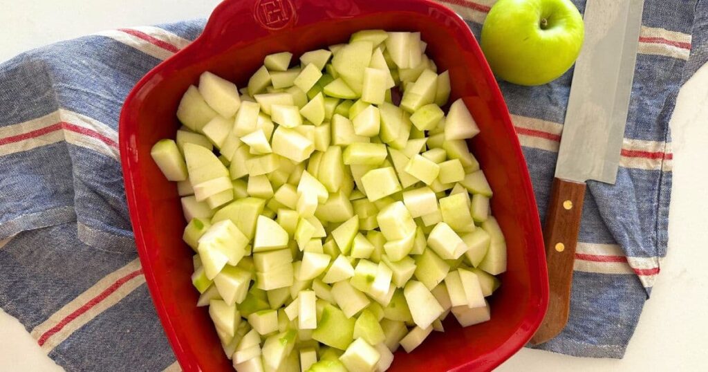 Grab a baking dish (my dish is 11" x 9"). Peel, core and chop the apples into small chunks and place them in the base of the baking dish. I haven't greased my baking dish before adding the chopped apples, but you can if you want to. That's how easy the apple filling is to prepare ... you just have to chop the apples up!