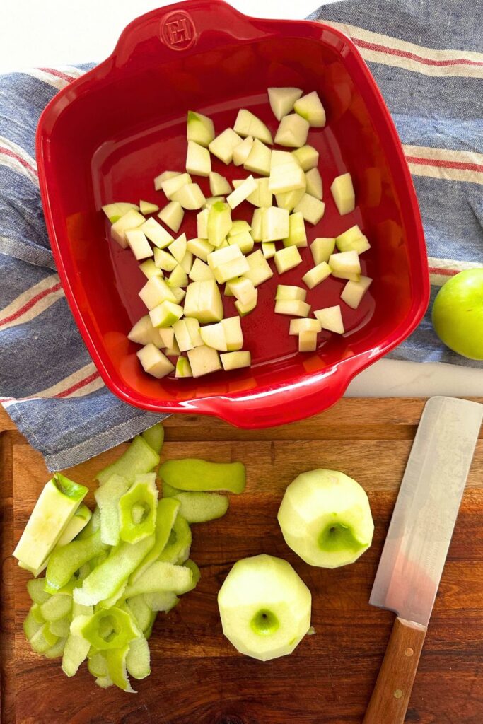 - Grab a baking dish (my dish is 11" x 9"). Peel, core and chop the apples into small chunks and place them in the base of the baking dish. I haven't greased my baking dish, but you can if you want to.