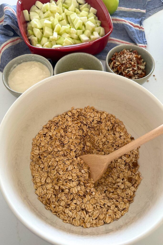 - Next, add the rolled oats, sugar and spices to a large mixing bowl and stir until well combined. Add the chopped pecans now if you're using them.