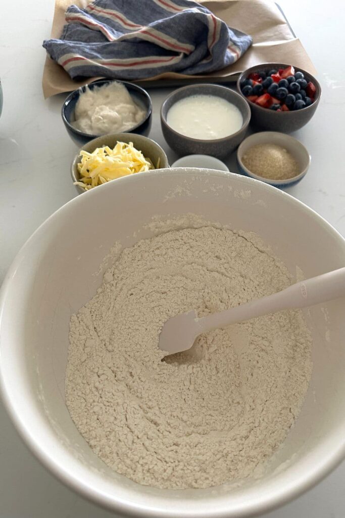 - Now, pour the buttermilk mixture (wet ingredients) and the chopped berries into the dry ingredients and stir together to form a firm, wet dough. It should be "scoopable".