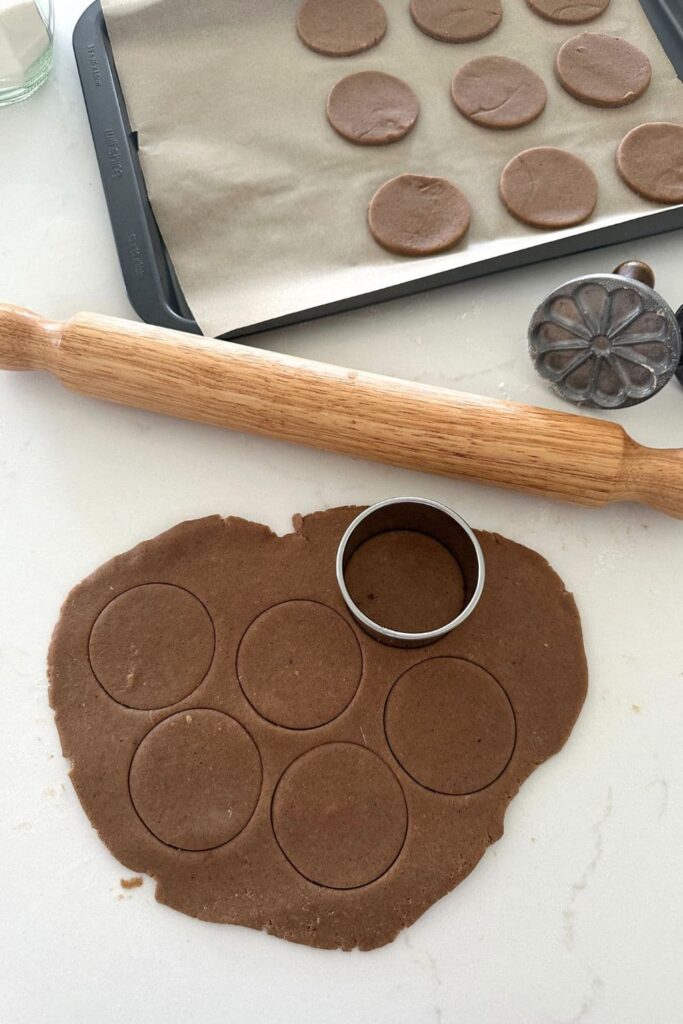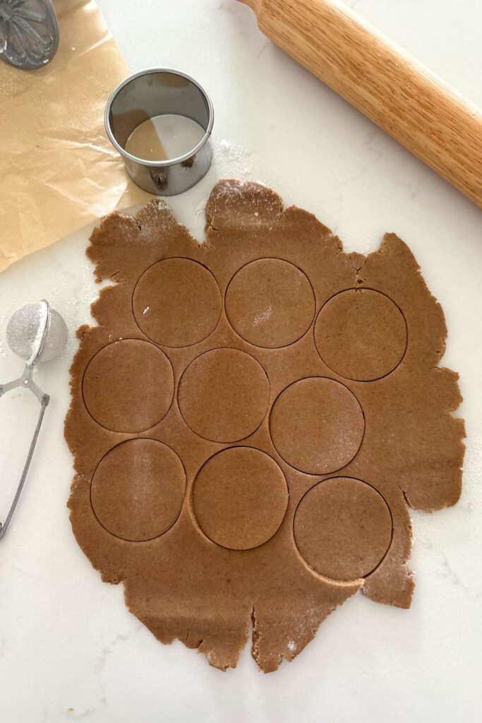 Many homemade biscoff cookie recipes suggest using an embossed rolling pin or even a specific biscoff cookie cutter or fluted edge rectangle cookie cutter. I honestly did not have any of these in my kitchen and didn't want to buy them just for one recipe, so I've kept things simple and just used a round cookie cutter.