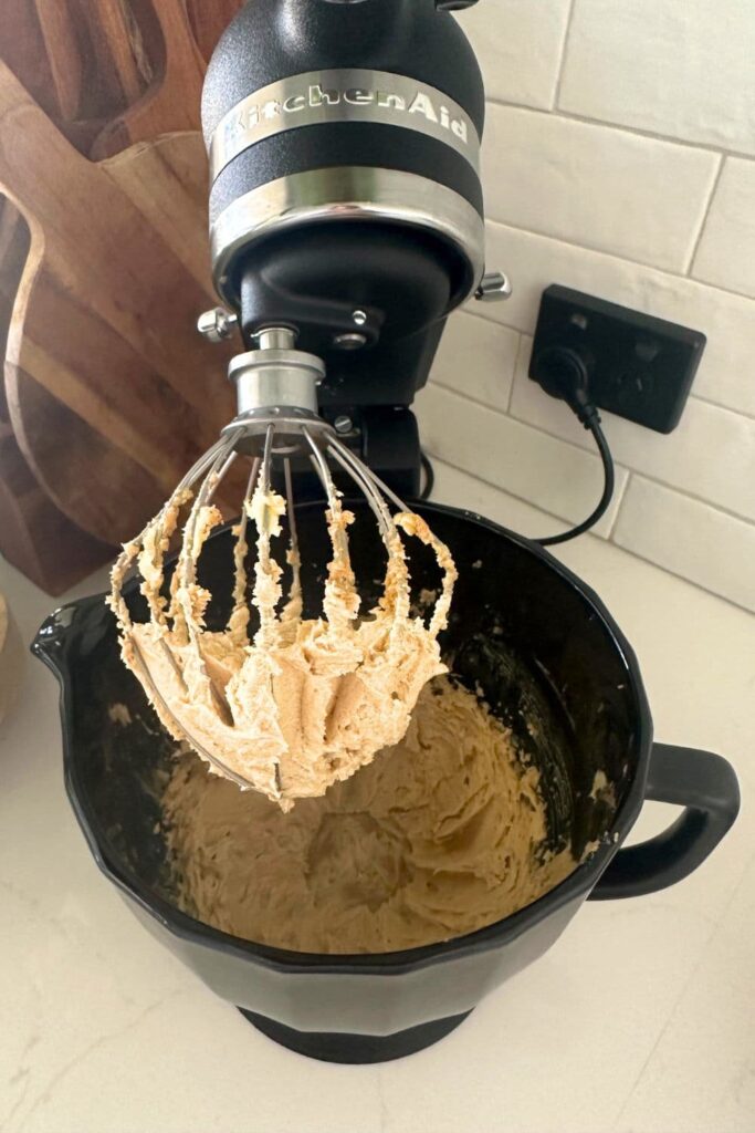 - To the bowl of your stand mixer, add the softened butter, white sugar and dark brown sugar and whisk until the mixture is light and fluffy.